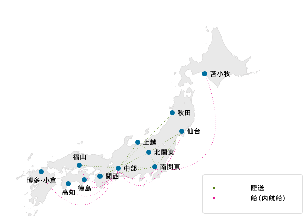 5か所の大型物流センターを含め日本全国に物流拠点を展開しております。